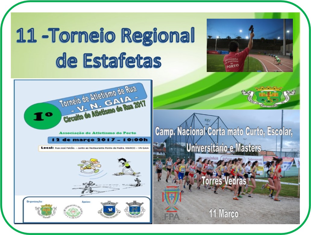 Torneio Regional de estafetas, torneio de atletismo em rua preenchem o fim de semana a nível regional. O Campeonato Nacional de Corta-Mato Escolar, Curto, Universitário e Masters encerra as competições de corta mato, em termos nacionais .
