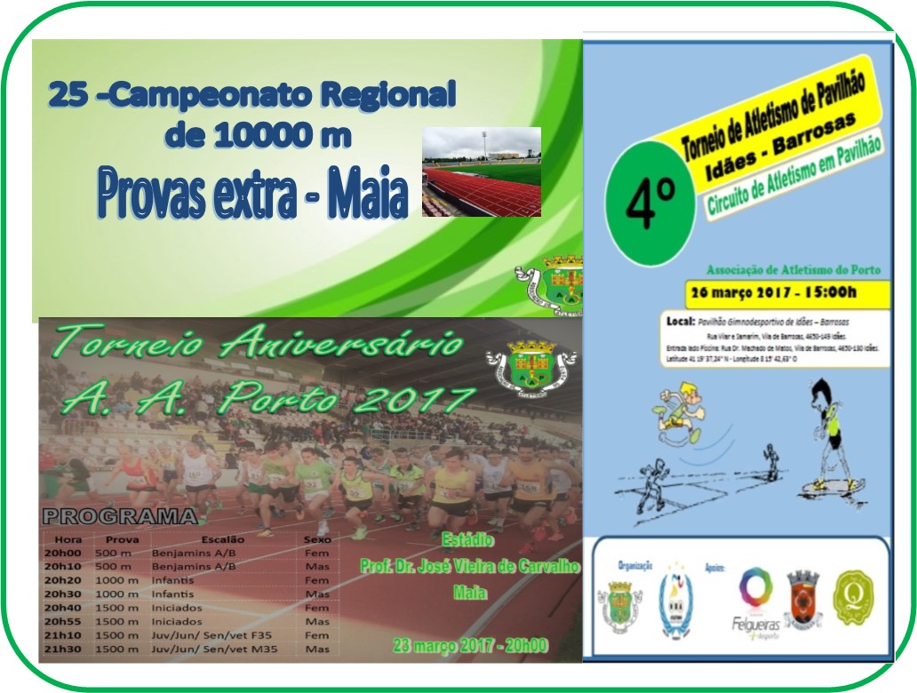 Em semana de aniversário as competições começam mais cedo. Na quinta feira, dia em que a A. A. Porto comemora 91 anos, realiza-se o Torneio Aniversário. No fim de semana, no sábado decorre o Campeonato Regional de 10000 metros e no domingo, em Barrrosas, Felgueiras, o 4º Torneio de Atletismo em pavilhão.
