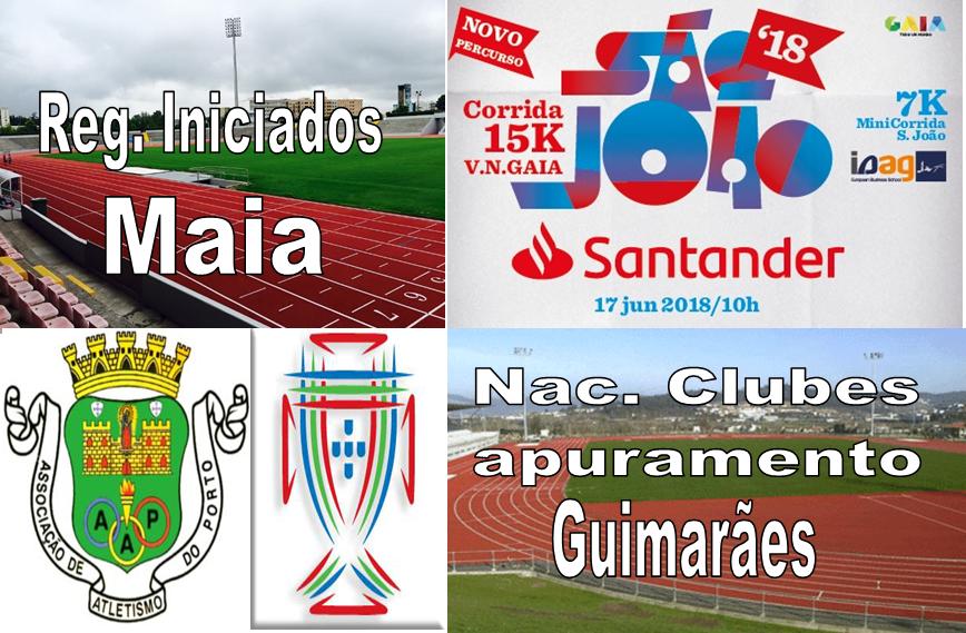 O próximo fim de semana trás várias competições. Na Maia realiza-se o Campeonato Regional de Iniciados, em Guimarães teremos o apuramento para o nacional de clubes com 10 clubes da Associação de Atletismo do Porto a marcarem presença. Na estrada, será a corrida de S. João, a marcar o fim de semana.